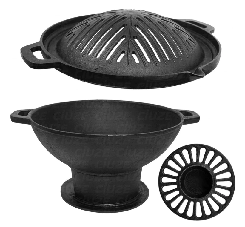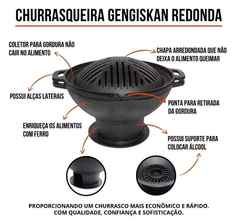 A Churrasqueira Gengiskhan é fabricada em ferro fundido de alta resistência e durabilidade. A Gengiskhan é uma panela funda de ferro com uma grelha em sua superfície, como uma espécie de tampa. Essa grelha pode serinclinada, reta ou lisa,, e serve para colocar a carne disposta sobre ela. Essa panela serve como um braseiro, ou seja, em seu interior é colocado o carvão que irá fazer com que a carne asse.