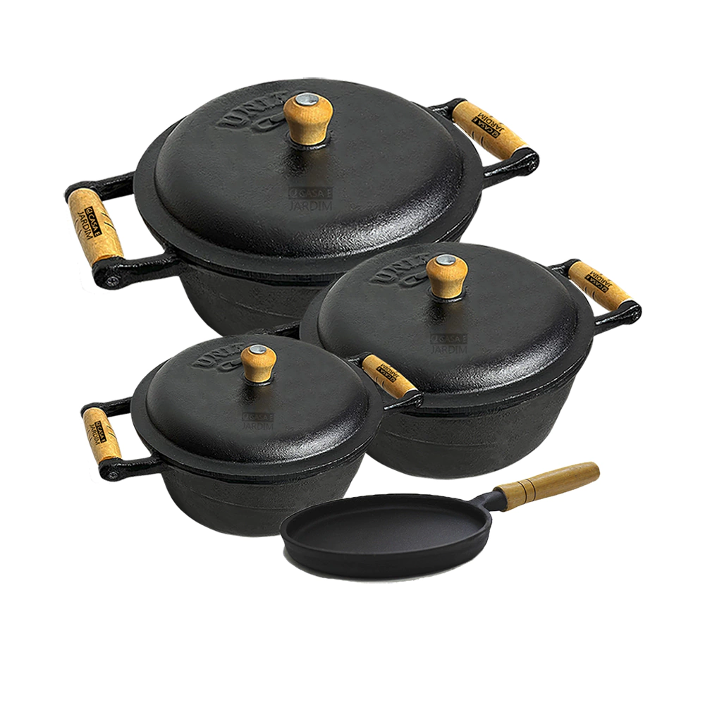 As panelas e utensílios domésticos de ferro fundido da Casa e Jardim apresentam inúmeras vantagens em relação aos outros materiais, por serem: Atóxicas, Nutritivas, Conservadoras de calor (mantém os alimentos aquecidos por mais tempo), Antiaderente (a porosidade do ferro fundido cria camada anti-aderente), Vedadas, Estáveis (o peso do ferro melhora a fixação tanto na trempe quanto na mesa), Versáteis, entre muitas outras vantagens que você descobrirá!